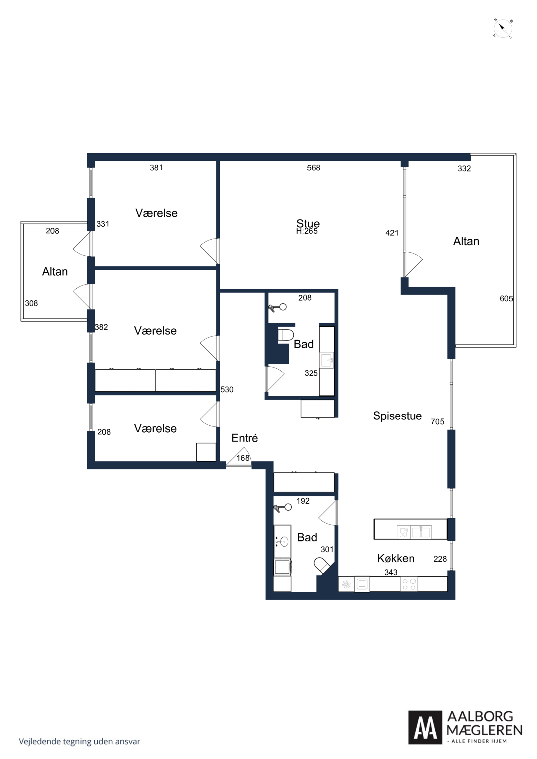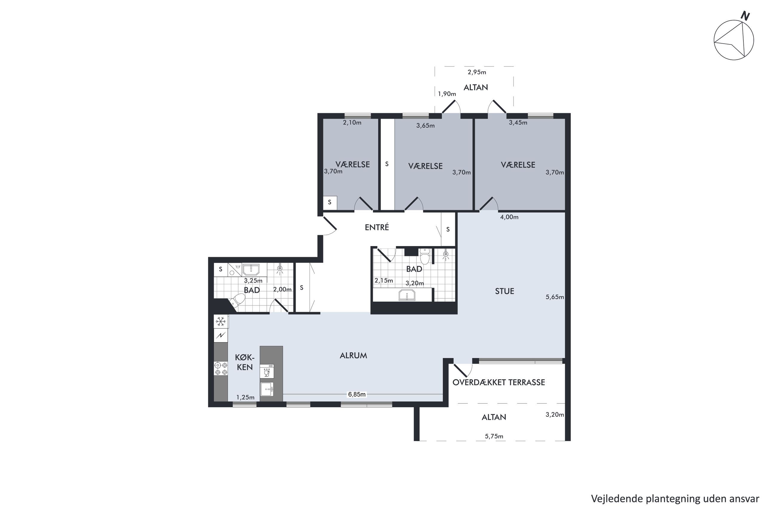 Boligens planløsning er gennemtænkt til både par og familier. Du får tre lyse og rummelige værelser, to elegante badeværelser – begge med gulvvarme og det ene med vaskesøjle – samt et åbent køkken-alrum, hvor køkkenets praktiske ø indbyder til både madlavning og samvær. Stuen er indrettet med indbygget reolsystem og store vinduespartier, der slipper lyset ind og trækker udsigten helt ind i rummet.