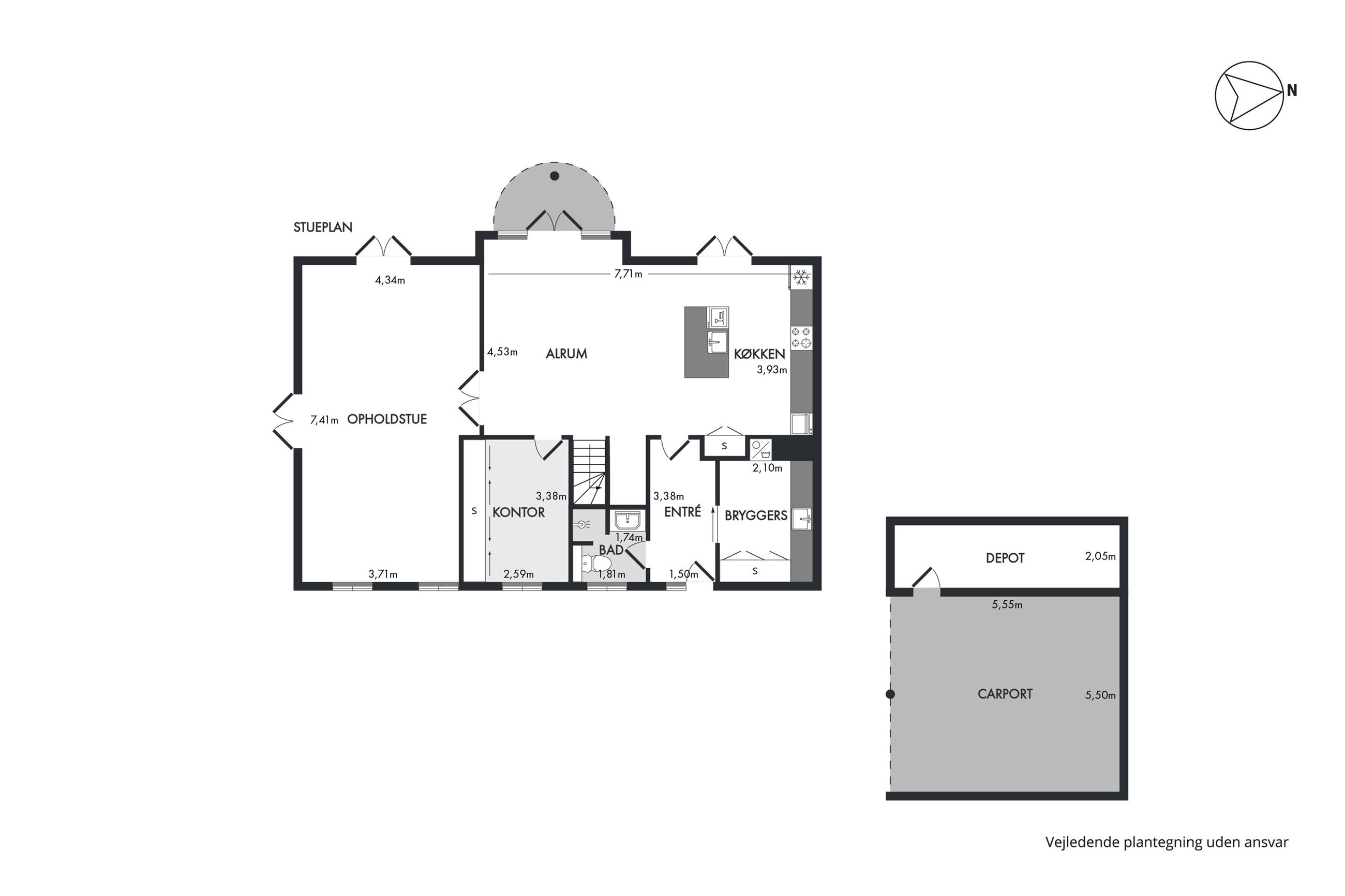 Via flot indgangsparti er der adgang til entré med adgang til fint bryggers og godt badeværelse. Herfra er